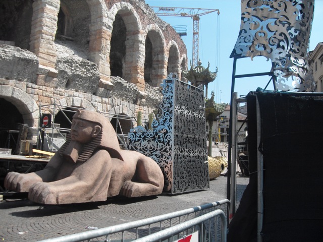Na to, abyste se dostali do zákulisí slavného operního festivalu ve Veroně, nepotřebujete zvláštní pozvání ani novinářský press pas. Stačí, když se jako obyčejný turista projdete kolem amfiteátru – skladiště kulis je přímo na ulici. My jsme zrovna natrefili na stěhování kulis z Verdiho Aidy. Egypt a římský amfiteátr v jednom místě, to je lákavý historický mix, tak proč nevyužít příležitost a nevyfotit se třeba se Sfingou…
