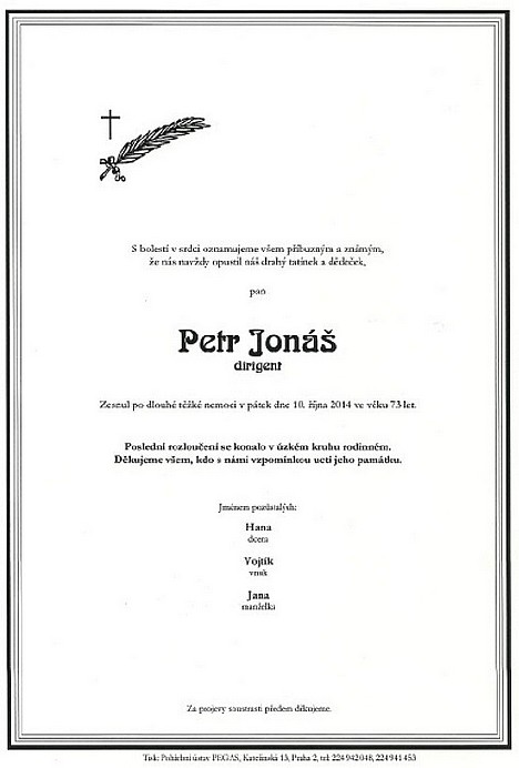 Smutná zpráva přišla v průběhu sobotního večera. Po dlouhé těžké nemoci zemřel v pátek 10. října ve věku třiasedmdesáti let dirigent Petr Jonáš.Petr Jonáš se narodil 4. ledna 1941 v Praze. V roce 1965 absolvoval Konzervatoř v Praze, a to varhanní oddělení u Jana Bedřicha Krajse a dirigování u Václava Smetáčka. Již za studií byl sbormistrem vinohradského Hlaholu, na přelomu šedesátých a sedmdesátých let působil jako umělecký vedoucí a dirigent Pražské komorní opery. V sedmdesátých letech pracoval jako lektor a dirigent Komorní opery Národního divadla, kde nastudoval Mozartův Únos ze serailu, s operou Národního divadla se zúčastnil i několika zájezdů do zahraničí. V sedmdesátých a osmdesátých letech působil jako dirigent a sbormistr Státní opery v Istanbulu a jako šéf opery v Ústí nad Labem, kde v letech 1990 až 1992 zastával post ředitele, do čela ústeckého divadla se pak vrátil znovu v letech 1998 až 2006. Jako dirigent hostoval v mnoha městech ve Francii, Itálii, Španělsku, Řecku, Německu, Belgii, Finsku, Dánsku, Švýcarsku, Lichtenštejnsku či Turecku, účinkoval na mezinárodních festivalech (Nantes, Athény), je také autorem koncepce a spoluautorem projektu České námořní divadlo.