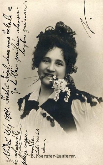 Snad neuškodí, když věnujeme této vynikající umělkyni alespoň krátkou vzpomínku. Pražská rodačka Berta Lautererová studovala zpěv a klavír na Žofínské akademii, poté na konzervatoři zpěv u Antonie Plodkové. 12. srpna 1887 vystoupila osmnáctiletá dívka poprvé na jevišti Národního divadla. Zpívala Agátu ve Weberově Čarostřelci. V tehdejší „vlastenecké“ úpravě, kterou pro divadlo pořídil Jindřich Hanuš Böhm, se ovšem hlavní ženská postava romantické opery jmenovala Lidunka, myslivecký mládenec Max se proměnil v Liborína a hajný Kuno se počeštil na Doubravu. Úspěch byl jednoznačný, rychle následovala nabídka k angažmá a s ní jedna role za druhou.